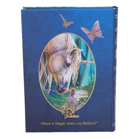 Discover the magic of enchantment with this beautifully crafted Fairy Whispers Journal, featuring Lisa Parker's captivating artwork. The front cover showcases a mystical bluebell wood scene where a graceful unicorn leans in to hear the secrets of a delicate fairy, enhanced with shimmering gold-foiling for added elegance. Measuring 7 x 5 inches, this journal contains premium sketch book quality plain paper, perfect for sketching, writing, or capturing your own magical moments. A gold-coloured ribbon bookmark is included for convenient page marking. The back cover features the original artwork beautifully framed within an oval design, making this a treasured keepsake for fantasy lovers and creative souls alike.