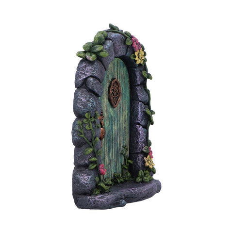 Step into an enchanted woodland with this whimsical fairy door, complete with a charming stone arch and vibrant green wooden entrance. Delicate vines climb the archway while floral brass details and cheerful red and yellow blooms add magical character. A rustic bronze lock and handle invite curious visitors to imagine the secrets beyond. Hand-painted by Nemesis Now artisans, each piece is uniquely crafted with subtle variations that celebrate its individual charm. Perfect for garden lovers and fairy tale enthusiasts alike.